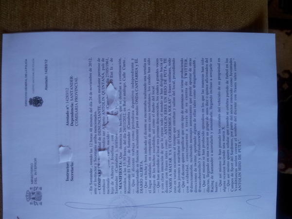 #139• Escrito originalmente por @Lolopahuer Vamos a ver la película esta del An-Tolín. Presenta una supuesta denuncia de unos hechos con la fecha mal, y además, haciendo públicos sus propios datos personales. Y luego, presenta una segunda foto donde tapa sus datos con papelucos. Spoiler: si,luego tuitea no se que de sosfueraviolentoscdlracing y se queja del coeficiente intelectual de las personas,asi como que no se le hace raro que haya tanto paro en cantabria. | |