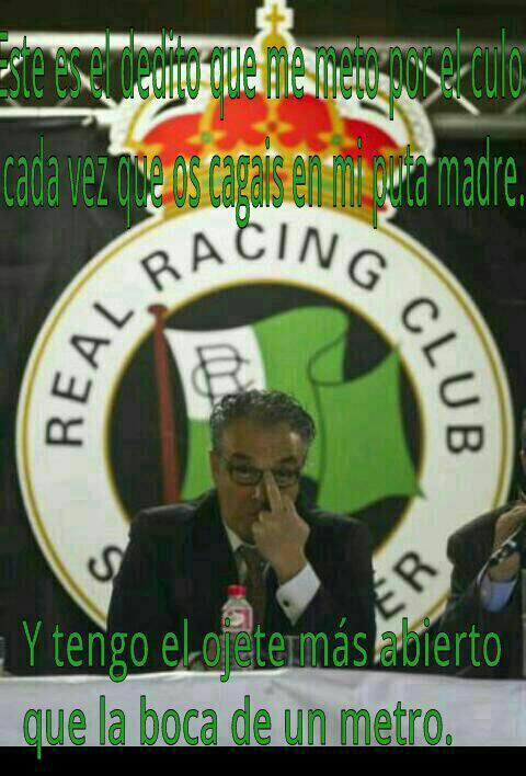 #243•• Escrito originalmente por @Castro2 Escrito originalmente por @Medueles.racing Escrito originalmente por @farfope los que no quieran ver al racing , que funden otro club nadie se lo impide , yo quiero mi racing y si muere que sea luchando en el campo . sr alamo ,mendueles , colsa y demas si quieren fundar un club , estan en su derecho , pero ustedes no son nadie para matar al racing ,el racing morirá cuando ya no pueda mas pero el solito , como le ha ocurrido al palencia , salamanca y muchos otros . Pero solito ,SIN FORZARLO A ELLO . me da que aqui hay muchos en esta ciudad que les encanta el protagonismo . El que lo ha propuesto ha sido Colsa, el gran adalid del racinguismo peñista y digamos "radical", así que tan desencaminado no estaremos los que ya no soportamos más esta situación. Eso no es cierto. No te gustaría que fuera cierto pero ha sido Colsa el que lo ha "sugerido" esta mañana. A mi no me mires. No estoy hablando de refundar, si no de instar a la liquidación, aunque es probable que una cosa sea el paso previo de la otra. | |