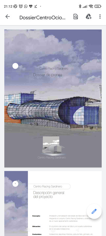 Escrito originalmente por @Castro2 Ahí está el dossier https://web.archive.org/web/2003121[....]nero/DossierCentroOcioSardinero.pdf No se si en el ordenar tengo fotos que no salen ahí, tendría que mirarlo. Gracias, no pasa nada, no salen imagenes por dentro pero mas o menos la idea esta, en un sitio dice entre 4000 y 5000, yo creo en eso añadir una tribuna o ampliar este en 5000 personas Y justo el proyecto habla de lo que se habla, parking subteraneo que ha hablado el ayuntamiento de hacer, ampliar grada que es lo que digo yo y me parece fundamental por comodidad y lo que han comentado en diferentes ambitos, debates de radio, foreros y demas de añadir servicios al estadio, no como hotel que no me parece lo mejor, pero si otros srvicios como restaurante y otros usos para los bajos o entresijos del campo | |