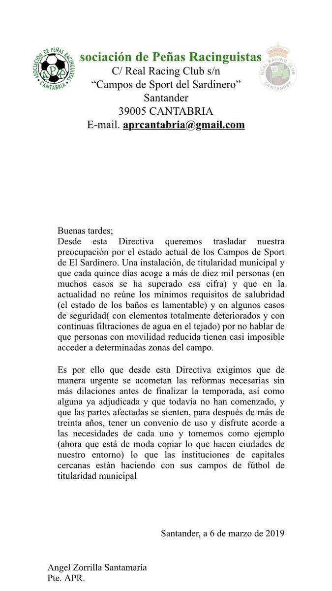 #1.771•• Escrito originalmente por @ociepa Escrito originalmente por @rey_del_norte Escrito originalmente por @ociepa Escrito originalmente por @kartabro Escrito originalmente por @rey_del_norte Escrito originalmente por @Racinguidealista Escrito originalmente por @ociepa Alcalde de Coruña: Cita: "Lo que nos interesaba era tener un estadio de Riazor con el nivel de dignidad que merecían las personas que vienen a él", señaló el primer edil, quien añadió que supone, además, "tranquilidad para todos" porque las cubiertas habían dado varios sustos en épocas de temporal. "Cualquier cosa que podamos hacer por el Dépor lo hacemos por el bien de la ciudad. El Dépor genera imagen para la ciudad.Desde el principio tuvimos claro que había que pasar página a épocas pasadas con Ayuntamiento y club enfrentados", sostuvo el alcalde. Siento verguenza del trato dado al racing por la clase politica de santander y cantabria en los ultimos años. Trato que es infinitamente peor al dado cuando en el racing estaban pernia, piterman o los diaz. Un abrazo para de la serna e igual y su querido partido, que tanto cariño le tienen al racing y al futbol y deporte en general. Y otro para el resto de partidos, culpables en que el racing llegara a la situacion catastrofica en la que está desde hace años. Estoy de acuerdo contigo pero en mi opinión ese trato se debe sobre todo al que le está dando parte de la sociedad cántabra al Racing. Ahora está hipervigilado por esa parte de la ciudadanía en cuanto a la inyección de cualquier cantidad de dinero público o incluso cualquier "favor" que la Administración pueda hacer al club, y están haciendo mucho ruido, especialmente en redes sociales. Da igual que una ayuda al Racing, económica o no, esté fundamentada o razonada, eso es lo de menos para esta gente. La institución verdiblanca para ellos se ha convertido en un recurso fácil para dar "ejemplo" e incluso a veces hacer ejercicios de demagogia. Y claro, los políticos en general, siempre tan sensibles a la temperatura de la opinión pública en busca de votos, se amoldan a esto y ahora tienen un miedo tremendo a que se les asocie con cualquier subvención o acción que implique un beneficio al Racing, aunque sea para arreglar un estadio que es municipal... Por eso no se atreven a realizar un convenio y hacer las obras necesarias en los Campos ni hubo patrocinio del Gobierno despues de meses y meses dando a entender que sí, etc. Lo tenemos crudo los racinguistas y el propio club en nuestra propia tierra actualmente, la verdad. Otra herencia más de la época de Pernía y compañía. Hoy el diario pone una notica que titulan: LaLiga traslada al Racing su preocupación por el estado de los Campos de SportLastima que no pueda leer el panfleto montañés, si alguién nos puede hacer un resumen se lo agradezco. Dice que el presi, Víctor Alonso, un consejero y Juanjo Uriel se han reunido con un consejero de la LFP y con el Comité de Control Económico de LaLiga para ver qué hacer en caso de ascenso. Nada que no sepamos: poner los asientos, iluminación de las torretas e interiores, asegurar la seguridad, poner una zona mixta y adaptar el estadio a la llegada del VAR a Segunda el año que viene. Eso y que aún no se sabe nada del convenio con el Ayuntamiento, lo que puede obligar a PITMA a soltar la pasta por gastos que les correspondan a ellos y también al Ayuntamiento en caso de ascenso. ¿Pero no era que juanjo uriel habia dimitido porque no pintaba nada en el consejo y estaba muy dolido?, que cosas mas curiosas pasan... En cuanto al ultimo parrafo, pues igual acabamos viendo como el racing (financiado por PITMA) acaba pagando las obras necesarias y va a los tribunales para que dictaminen quien tiene que hacerse cargo de cada una de esas obras. Obviamente el gobierno ya que las instalaciones son suyas. Es como si alquilas una casa y te salen goteras y humedades, obviamente los gastos corren a cuenta del arrendador, pues esto es lo mismo el gobierno tiene que garantizar unas instalaciones dignas para el Racing y que que cumplan con las normativas de seguridad y calidad. Por cierto, ayer leí en las rrss que el Racing cedió la parcela del antiguo Sardinero al ayuntamiento a cambio de poder hacer uso del nuevo estadio, entonces arreglar el estadio no sería un tema de "solidaridad" para con el Racing sino una obligación que no están cumpliendo. Cuanto daño ha hecho Revilluca... y la fábula de: "El gobierno ha dado mucho dinero de Cantabria al Racing". No es el gobierno, es el ayuntamiento de santander el propietario. Y si, ciertos problemas estructurales esta claro que son obligacion del propietario. Pero cuidado, otra cosa es cambiar la iluminacion, hacer obras interiores para adaptar una zona mixta, reformar baños, asientos, etc. Esas cosas ya son otra pelicula. Si bueno con gobierno me refería al ayuntamiento de Santander. Es como todo, el Racing se tendría que hacer cargo de los gastos de mantenimiento, pero reformar unos baños que parecen una piscina, rehabilitar unas gradas que tienen todos los asientos rotos, arreglar la cubierta del estadio... yo creo que eso le corresponde al Ayuntamiento. Lo que tu comentas de arreglar la zona mixta, iluminación y demás, que es una parte estética por así decirlo, tendría que pagarlo el Racing. También te digo que para que el Racing se tenga que gastar mucha pasta en arreglar un estadio que no es suyo prefiero que hagan uno nuevo (algo poco o nada viable a día de hoy). Edito: adjuto el comunicado de la APR al respecto.