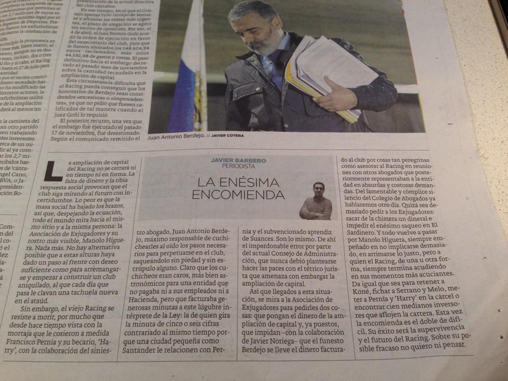 Escrito originalmente por @camposdesport Escrito originalmente por @Castro2 Escrito originalmente por @Medueles.racing ¿Cuándo va a recibir Higuera el reconocimiento que se merece?. Algunos no le tragais y nunca he entendido el porqué. Está trabajando por la SUPERVIVIENCIA del Racing y parece como si no hiciese nada. Tiene todo mi apoyo y mi agradecimiento. Yo soy uno de los que no le tragaba, pero lo que ha hecho los últimos años, me ha hecho cambiar de opinión. Desde luego hay que reconocerle, que trabajo por el Racing, siempre ha hecho. Por cierto... no podrían pedir el embargo de la cuenta de la ampliación los propios trabajadores? No son acreedores también? Tienen que llegar a denunciar para que fuera así? Es una vergüenza que la justicia no piense en los empleados, que tienen que sobrevivir en el día a día. Yo hasta desconozco si lo que reclama es de la deuda del concurso o de despues... Me referia a lo que pide Berdejo. es posterior al concurso. | |