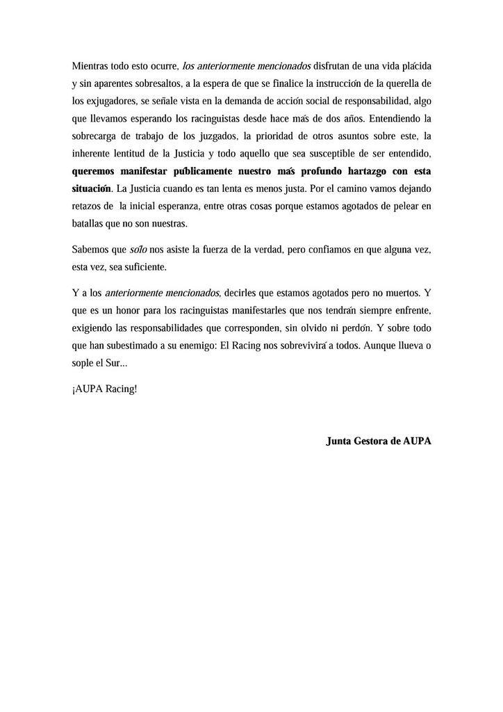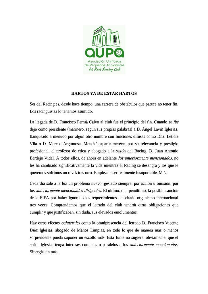 #249• Escrito originalmente por @netecillo Ya se que puede sonar un poco coñazo, pero habeis pensado en poner una mesa en alguna puerta del estadio antes del partido e intentar que la gente se inscriba alli mismo? Los días de partido estaremos en el local una hora u hora y media antes (durante el mes de septiembre). Desde finales de julio llevamos yendo todos los días de lunes a viernes al mismo local, se ha puesto en twitter, facebook y aquí. Y no lo sé exactamente, pero calculo que andaremos por los 70 asociados si llegamos. La verdad es que a mí me resulta incomprensible y absolutamente decepcionante. El año pasado había 240 asociados, de los cuales 125 eran no accionistas a los que se les cedieron aquellas acciones que no valían un chavo para asociarse y que no sé si ahora son accionistas o no. Por otra parte llegan cantos de sirena diciendo a todo el que quiere oir que AUPA no tiene razón de ser ya, que ya no hay un accionista único, que estos son racinguistas, que no hay nada que fiscalizar, etc etc Además del unabonado de turno, el tonto a las tres, diciendo en el twitter que "ya sabe él cuáles son mis intereses en el Racing..." Vamos, que estoy un poquito hasta los cojones. Así en resumen | |