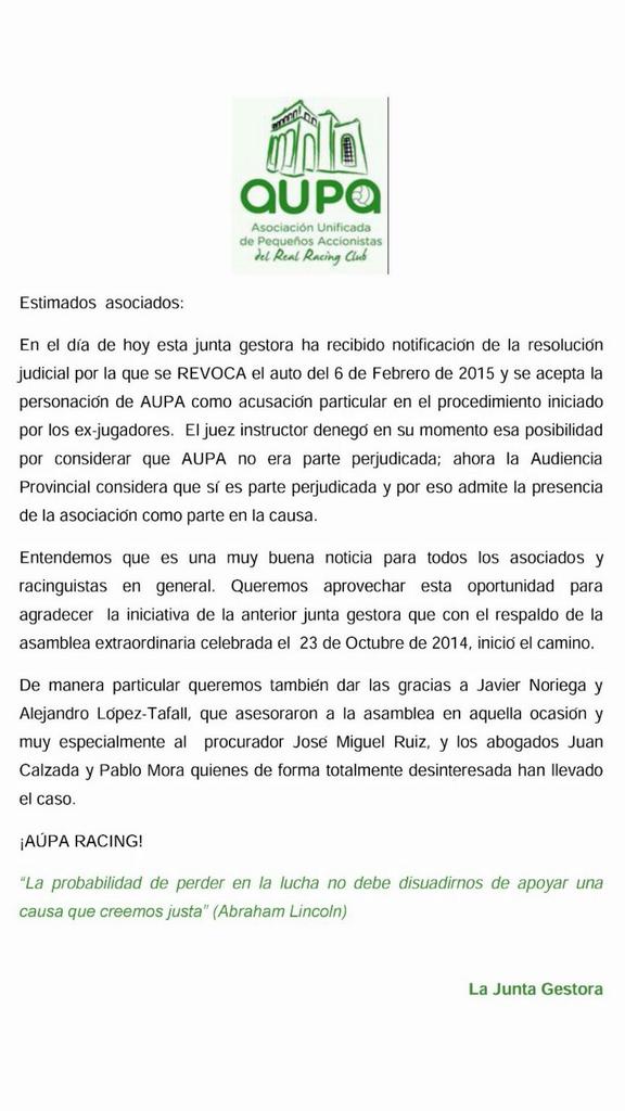 #286• Escrito originalmente por @jla65 Buenas noches. Creo que por aquí hay dos o tres socios de AUPA. Como sabréis jugabámos todos 4 euros en el número 52233. Por cada participación han tocado 20 euros; si tenéis la papeleta, físicamente, podéis pasar a cobrar en el próximo partido en casa, el 10 de enero. Si no la habéis recogido venís con vuestro DNI y os pagamos igual, claro. Buen presagio. Luego he leído que otras veces que el Gordo de Navidad acabó en 0, subió el Racing. Así que ya sabéis... Ojalá que se siga cumpliendo eso y que el 2016 nos devuelva a la división de plata. | |