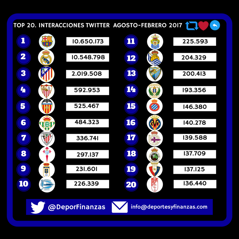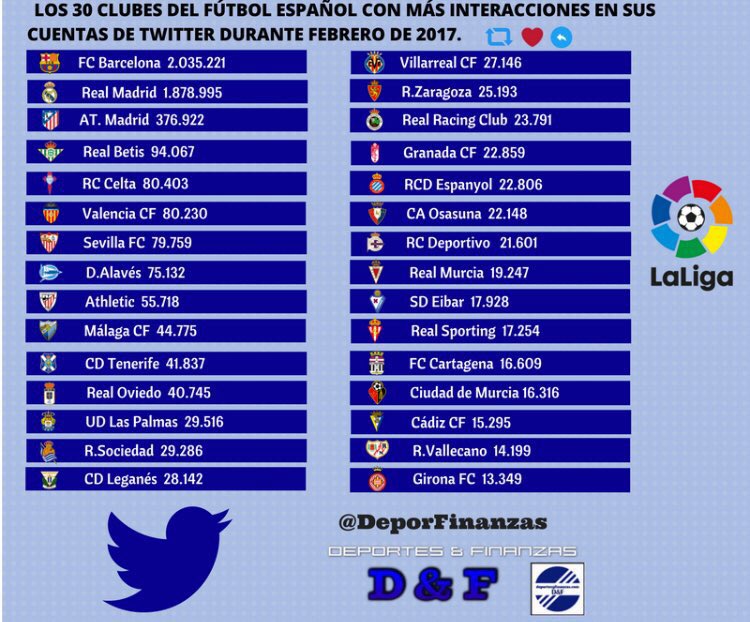 Pues hemos empezado "flojo". El año pasado solíamos ser siempre los primeros de 2B y en el top3 de 2A. Hombre depende si se juega en casa o fuera y de los goles, etc.. Lo que está claro es que este mes el liderazgo en interacciones se lo lleva el Burgos con el tuit de Messi. | |