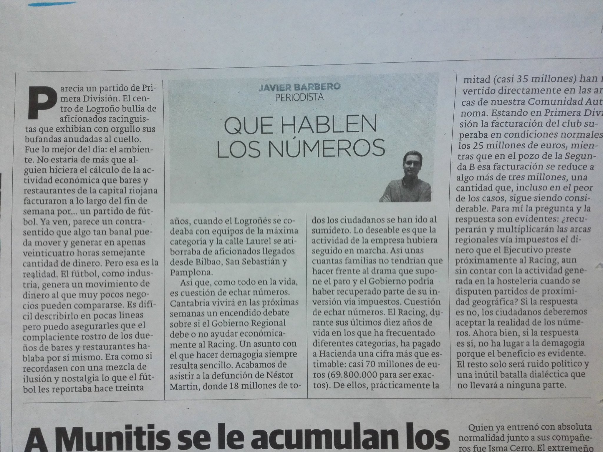 #841• Escrito originalmente por @camposdesport Hace unos dias se ha comentado por aqui por el foro, el dinero que el Racing habia aportado y tal. Pues bien, hoy dice Barbero en el Diario Montañes que en las ultimas 10 temporadas, casi unos 70 millones de Euros para Hacienda. Y dice que la mitad de ellos unos 35 para Cantabria. Y habra gente que seguira diciendo de cerrar el Racing. imagino que hablabas de este articulo.