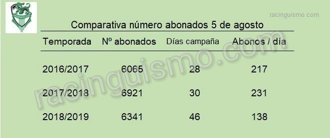 #386• Un ritmo de 1000 abonos/semana, de continuar así 3.000 abonados más al empezar la liga y teniendo en cuenta a los remolones que lo dejan para el último día, es probable que algo más la última semana, con lo que no iríamos a 9.500 abonados. Además si el equipo funciona, que desde mi punto de vista tiene buena pinta, estoy seguro que seremos más de 10.000 a lo largo de la temporada. De lograr estas cifras, entiendo que la campaña sería un exito. Aúpa Racing | |