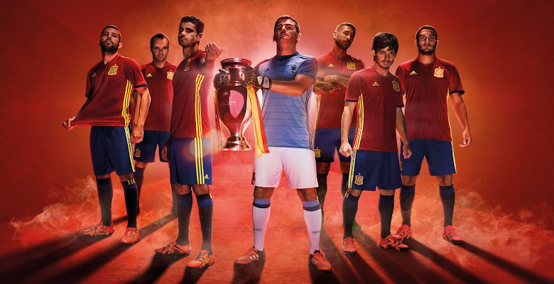 España vuelve al pantalón azul y medias negras en la primera equipación, asi como la vuelta al blanco en la segunda equipación; me encanta la decisión y las equipaciones, eso si, es para matar al que se le haya ocurrido la vuelta azul de las medias de la primera y el detalle de la bandera en la parte trasera del cuello dividida interna y externamente | |