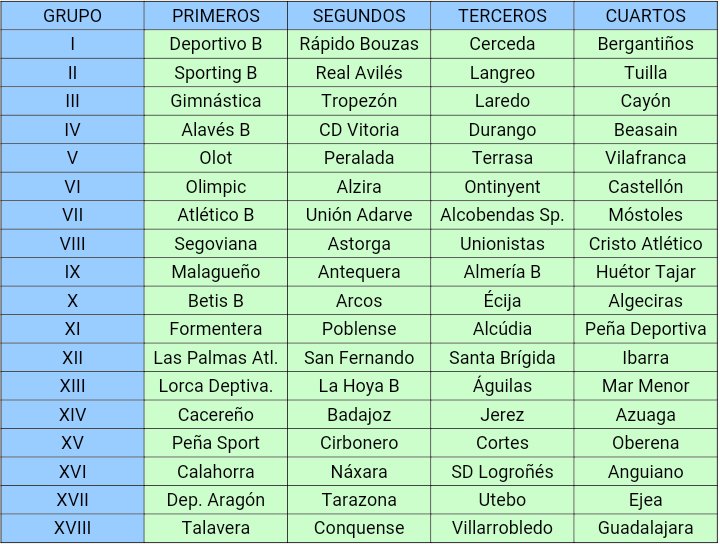 #25• Ascendidos 9 equipos por ahora (5 de ellos filiales): Olot, atletico de madrid b, formentera, depor b, gimnastica segoviana, betis b, talavera, las palmas atletico y zaragoza b. La gimastica de torrelavega, el tropezon y el laredo estaran esta tarde a las 17 en el sorteo. Hay en el bombo 9 primeros, 14 segundos, 9 terceros y 4 cuartos Creo que han pasado estos cuartos: cristo atletico, castellon, peña deportiva y beasain. Asi que la gimnastica puede jugar contra uno de estos (el cristo atletico de palencia por cercania no estaria mal) o contra un tercero. El trope contra un tercero o un segundo y al laredo le puede caer un primero o un segundo. | |