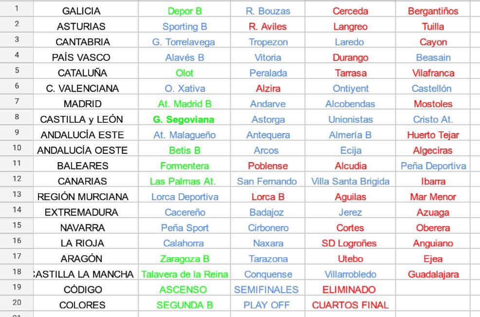 #26•• Escrito originalmente por @ociepa Vamos con el consuelo de los tontos Por contra algo sorprendente, los 4 canarios han ganado. Despues los catalanes 3 victorias, 1 empate. Y viendo como iba en la ida: Al final ni tan mal, dos equipos cantabros pasaron la eliminatoria y solo cayon queda fuera, eso si, con el resultado global mas amplio de todo el playoff, 6-0. Se completó el descalabro asturiano, los 4 equipos perdieron la eliminatoria. Solo el sporting b tiene opciones de ascender por ser campeon. El aviles que tiene un muy buen equipo, cayó contra el cuarto de castilla leon, cristo atletico. Los murcianos tambien perdieron todos. Incluido el lorca deportiva de quique pina, que cayó ante el betis b y el lorca b (filial del ascendido a segunda), que siendo segundo recibio un buen meneo en beasain (5-0) y en la vuelta aunque ganó poco tenia que hacer. Unica comunidad que ha hecho pleno, castilla y leon. Asciende gimnastica segoviana y siguen atletico astorga (a penaltis), unionistas y cristo atletico. Tambien muy bien los canarios ganaron 3 de las 4, solo quedó eliminado el ibarra contra el trope (era 4º). Ademas los tres con resultados globales muy holgados (las palmas atl que ascendio, ud san fernando y villa santa brigida). Sorprendente. Del grupo occidental de andalucia tambien ganaron 3, solo perdio algeciras (4º) por penaltis contra astorga. Aunque ecija tambien pasó por penaltis. Igual en el grupo de castilla la mancha, ganaron todos menos el 4º guadalajara. Y en madrid todos menos mostoles (4º). galicia 2 (asciende depor b) asturias 0 cantabria 2 euskadi 2 cataluña 2 (asciende olot) com valenciana 2 madrid 3 (asciende atletico de madrid b) castilla y leon 4 (asciende gimnastica segoviana) andalucia oriental 2 andalucia occidental 3 (asciende betis b) baleares 2 (asciende formentera) canarias 3 (asciende las palmas atletico) murcia 0 extremadura 2 navarra 1 la rioja 1 aragon 2 (asciende zaragoza b) castilla la mancha 3 (asciende talavera) | |