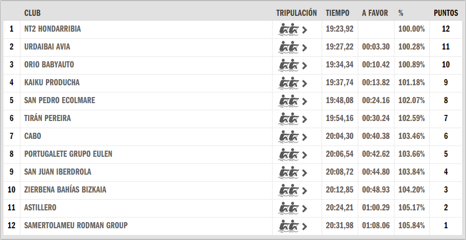 La verdad es que va a estar bonita la temporada, parecía que Hondarribia iba a seguir arrasando, pero Orio y Urdaibai no han dicho la última palabra. Bonito duelo también entre Tirán y Cabo, el sábado por centésimas en la misma tanda, y el domingo en un segundo y estando en tandas distintas. Astillero andará con Zierbena y probablemente con San Pedro entre octavos y décimos, pero parece que la temporada está salvada. Está habiendo tandas bonitas con mucha igualdad, habrá que ver quiénes van con todo ahora y quiénes reservan algo para septiembre | |