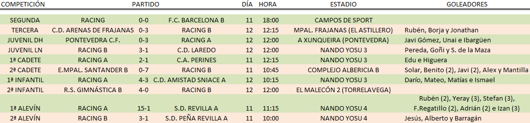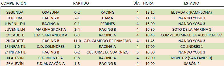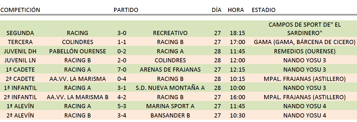 #897•• tercera division: arenas de frajanas 0 - 3 racing b goles de ruben sanchez, borja san emeterio y jonathan lopez division de honor juvenil: pontevedra 0 - 3 racing perdio el oviedo que iba lider y ahora encabezan celta y depor con 13 puntos, seguidos de racing y oviedo con 12. Partido interesante el fin de semana que viene en las instalaciones nando yosu, racing-celta. | |