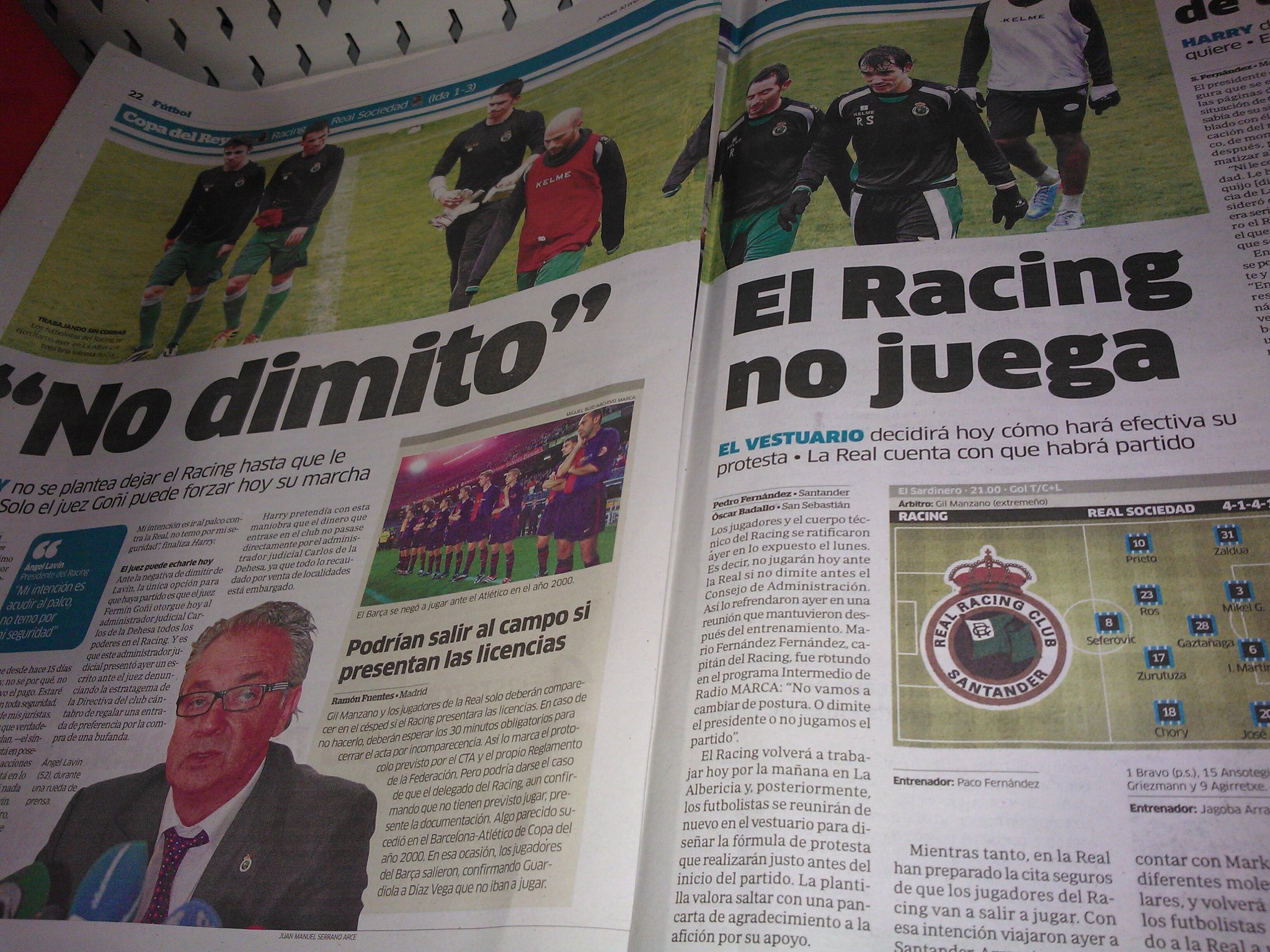 #61• Paco Fernández reafirmó esta mañana la intención del Racing de no jugar mañana ante la Real Sociedad ya que Ángel Lavín no ha dimitido. "Estamos igual, no hay ninguna novedad respecto al lunes, el comunicado era bien claro". Las palabras del entrenador del Racing se han producido poco después de que el presidente del club se acercara a las instalaciones de La Albericia sin que haya habido ningún contacto ni con el cuerpo técnico ni con los jugadores. "Ni siquiera le vimos", afirmó el entrenador. Y desde la lectura del comunicado del lunes, tampoco. "No se ha dirigido a nosotros. Ni nosotros a él. Estamos como cualquier racinguista, esperando soluciones", aseguró tajante. Además, ni la Federación Española, la principal interesada en que se juegue el partido, ni la AFE se han dirigido al vestuario del Racing para interesarse por el ultimátum. "Tendrán tantos interés como nosotros en que se arregle la situación", aseguró Fernández. Tampoco han decidido la operativa que realizarán si finalmente no se juega el partido: si no presentarán las fichas, si saltarán al campo pero no jugarán, si se quedarán en la banda. "Se decidirá el mismo jueves", aseveró Fernández, que tendrá informado al entrenador rival Jagoba Arrasate de la decisión final que tomen. El técnico del Racing no pudo ocultar su satisfacción por el regreso de Mamadou Koné a su disciplina hasta el 30 de junio. Esta mañana no entrenó pero se acercó hasta las instalaciones de La Albericia para saludar a sus compañeros. "Me alegro de que haya venido, el equipo le necesita y él quería quedarse aquí". El único que confiaba en su marcha atrás era el propio Fernández. "Era un pensamiento mío, una esperanza, no porque supiera nada. El chaval quería quedarse y confiaba en que al final iba a ganar su voluntad, porque, probablemente, no podría jugar en otro equipo sino resolvía su salida del Racing". Jagoba Arrasate (Real Sociedad): "Nos solidarizamos con los jugadores del Racing" El entrenador de la Real Sociedad, Jagoba Arrasate, ha comentado este miércoles, según recoge EFE, que no pueden "regalar nada" al Racing de Santander en el partido de vuelta de cuartos de final de Copa del Rey, recalcando que pese al tenso clima que hay en la entidad, con sus futbolistas, con los que se solidarizan, amenazando con no jugar el partido, deben estar atentos para pasar a semifinales. "Ellos están más unidos que nunca, la afición también está con ellos, si se juega van a hacer un esfuerzo extra la afición y ellos. Es un partido complicado, nosotros no podemos regalar nada", manifestó en rueda de prensa. Pese al 3-1 de la ida, cree que puede ser "peligroso" si especulan con el resultado. "Igual es el primer paso para equivocarnos. El 0-0 te puede valer pero te marcan en el 85 y luego sufres. Intentaremos hacer un buen partido, intentar hacer gol y ganar, y estaremos más cerca de pasar", aseveró. Además, les hace "mucha ilusión" una Copa en que últimamente han dado "más disgustos que ilusiones". "Ahora tenemos una oportunidad única para jugar semifinales, tenemos que tomar el partido como lo que es, muy importante", apuntó. No obstante, se sinceró al decir que les apena que un club como el Racing esté así. "Sobre todo por sus jugadores y nos solidarizamos con ellos, pero una cosa es esa y luego también pensad que es un partido de vuelta de cuartos de final de Copa y pensamos que se va a jugar el partido y el campo se va a llenar", argumentó. "Si allí nos dicen que no hay partido nos volveremos de vuelta, pero hay que pensar que habrá partido y que es muy importante, que habrá que afrontarlo con todas las garantías", añadió en este sentido. "Viajamos y hacemos todo lo que hacemos cuando tenemos un partido delante, que es muy importante y no podemos despistarnos con estas cosas", señaló. Además, deportivamente no hay nada asegurado pese a medirse a un Segunda B. "El gol que encajamos a última hora nos hace salir mañana con más tensión, si nos marcan un gol cambia un poco la eliminatoria. Si nos ganan 2-0 pues tampoco merecemos pasar a la siguiente ronda, las cosas como son. Perdimos una oportunidad de encarrilar más la eliminatoria, mañana debemos salir a ganar", ahondó. | |