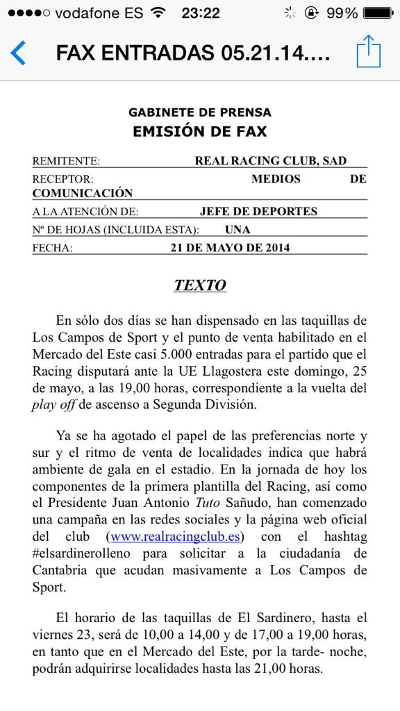 #341•• Habeis visto el video que hay en la pagina del diario sobre el racing, esta muy bien de cara a motivar a mas gente para el domingo Aqui os pongo el enlace, voy a mirar si puedo descargarlo y pongo enlace para que lo tengamos todos http://www.eldiariomontanes.es/vide[....]o-sube-racing-3580180388001-mm.html | |