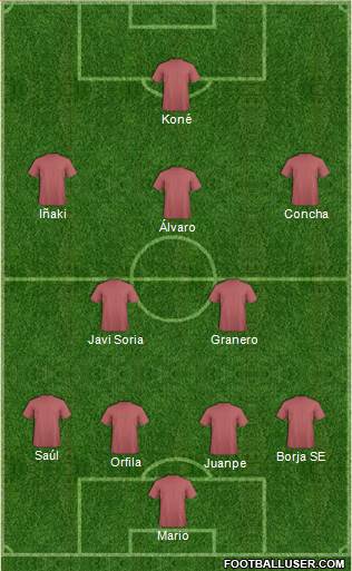 #15• Para este partido, entre que Koné quizas no esté al 100%, que Alvaro anda renqueante, y que Miguelez también anda tocado, teniendo el cuenta el campo que es, el nivel del rival, y que viene de jugar entre semana, trataría de realentizar en la primera parte el partido, intentar no llevar un marcador negativo al segundo tiempo, y la ultima media hora, en la que se presume ellos estarán mas fatigados, y tendrán que ir a por el partido, sacar a Alvaro y Kone para intentar alguna contra. Mario Borja Orfila Juanpe Saul Fede Granero Concha Adan Iñaki Mariano | |