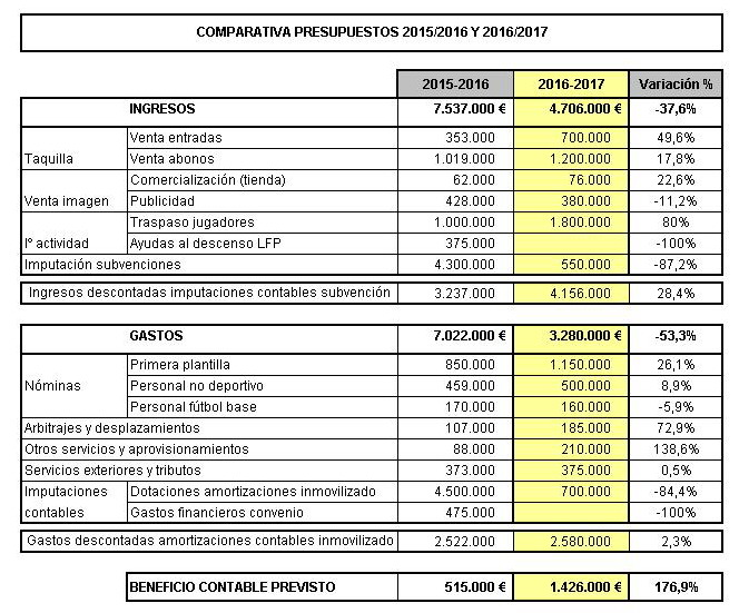 Por fin encontré el enlace! recordaba otros números pero vamos casi clavado. http://www.eldiariomontanes.es/depo[....]cortes-permiten-20161117230128.html Gastos de personal / 2.141.868 Sueldos, salarios y asimilados / 1.736.966 Cargas sociales / 404.912 | |
