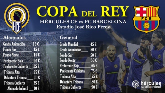 #258• precios del cultural-real madrid: Precio de las entradas #CulturalRealMadrid No Socios:Fondo 50, Preferencia 70, Tribuna 80 Socios:Fondo 25, Preferencia 35, Tribuna 40 precios del hercules-barcelona: