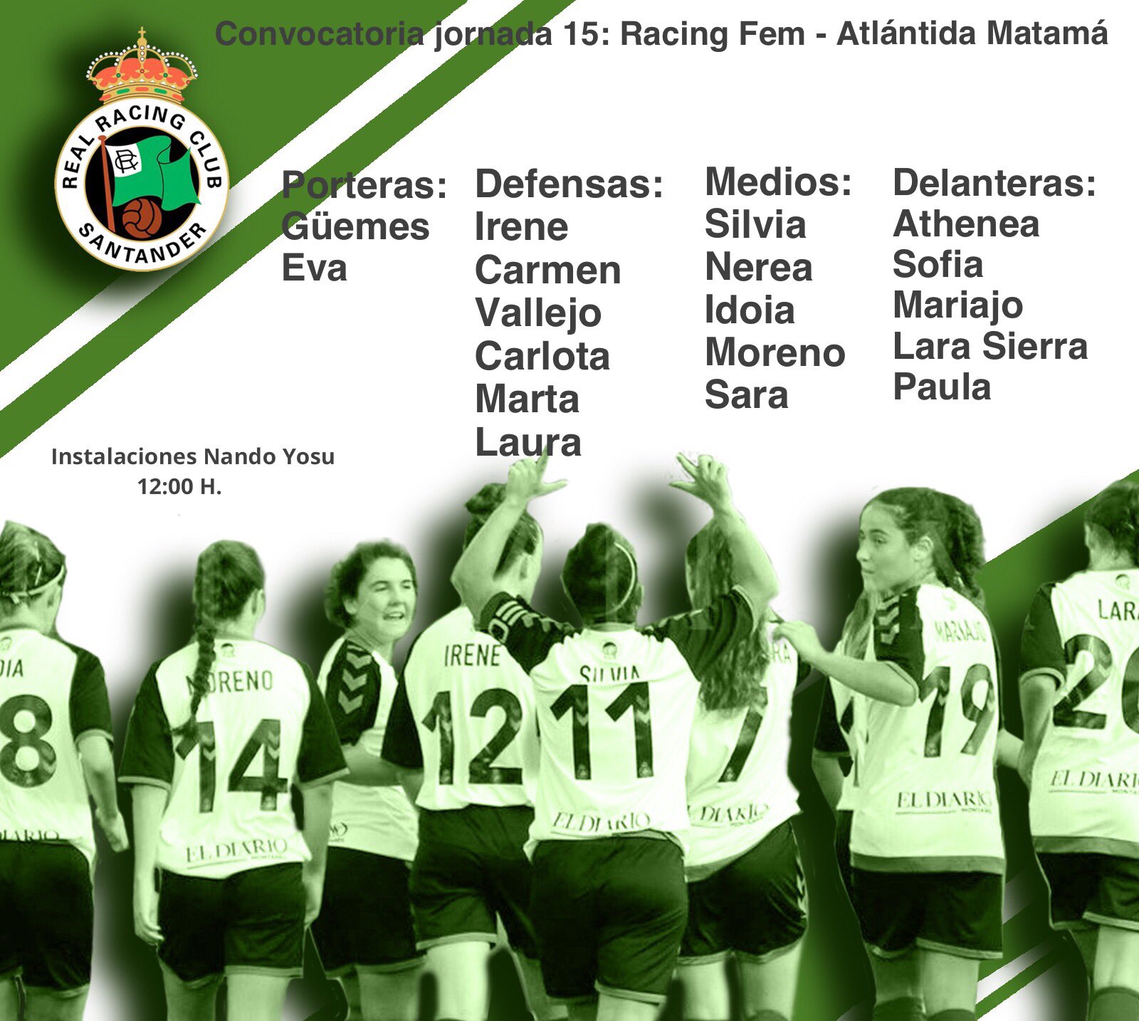Vuelve la liga para nuestro femenino, en el Sergas Multiusos de Santiago a las 12:30 de hoy Domingo frente al Victoria FC. Ésta es la convocatoria, en la que destaca la presencia, por vez primera de Nerea. Confianza ciega en ellas; son muy grandes!!! Suerte y a por tres puntos más #EquipoUnidoEquipoBueno#RacingGirls | |