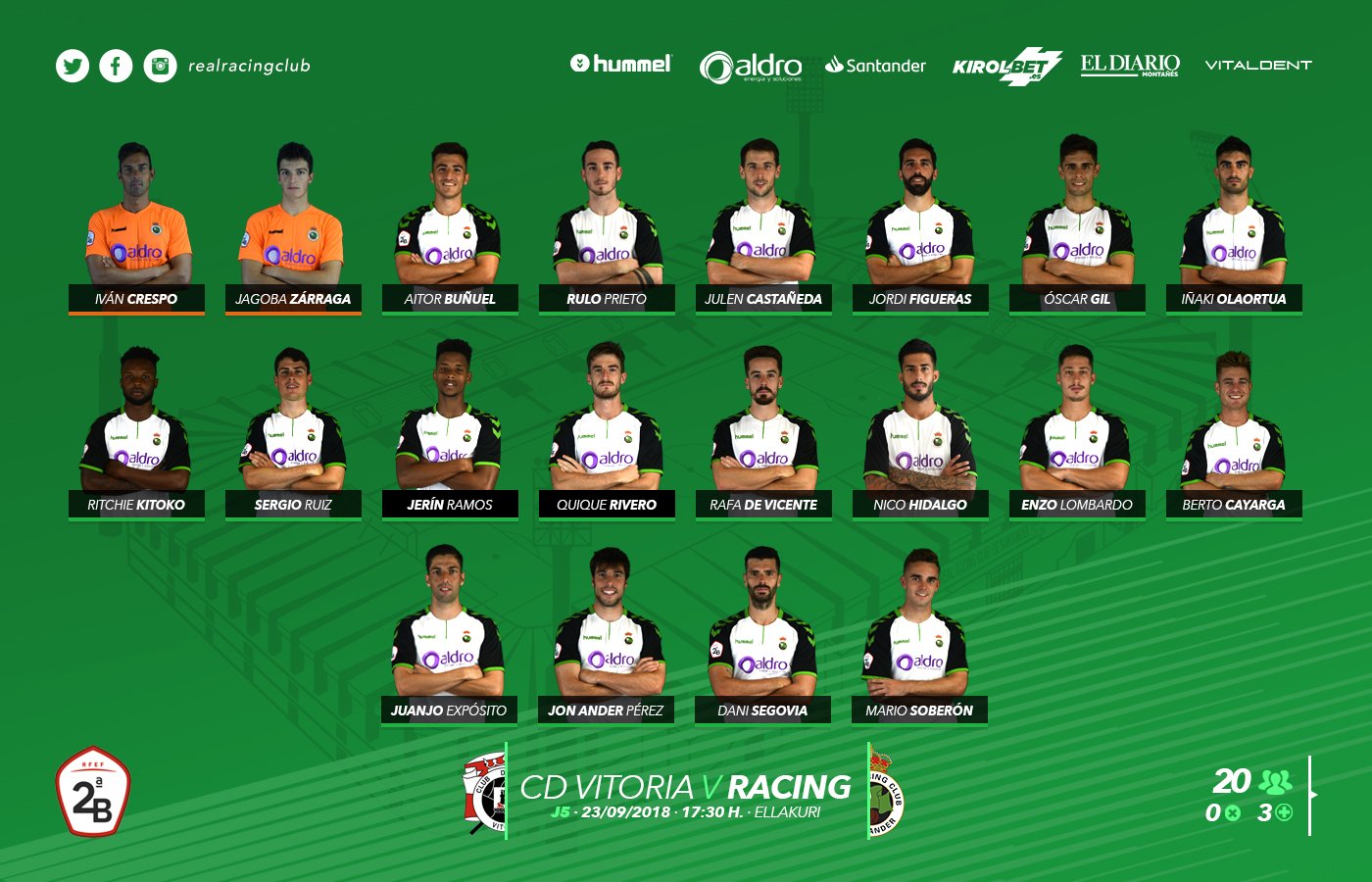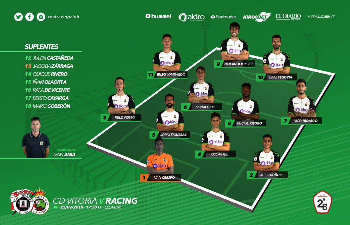 #52• segun apuntan algunos medios: ivan buñuel oscar gil figueras julen cayarga sergio kitoko enzo jon ander segovia Si al final se juega con 2 delanteros, a ver si se hace un buen partido y asi PL y RG dejan de dar por saco con que el racing de ania juega mal con 4-4-2 y que enzo solo puede jugar de media punta. | |