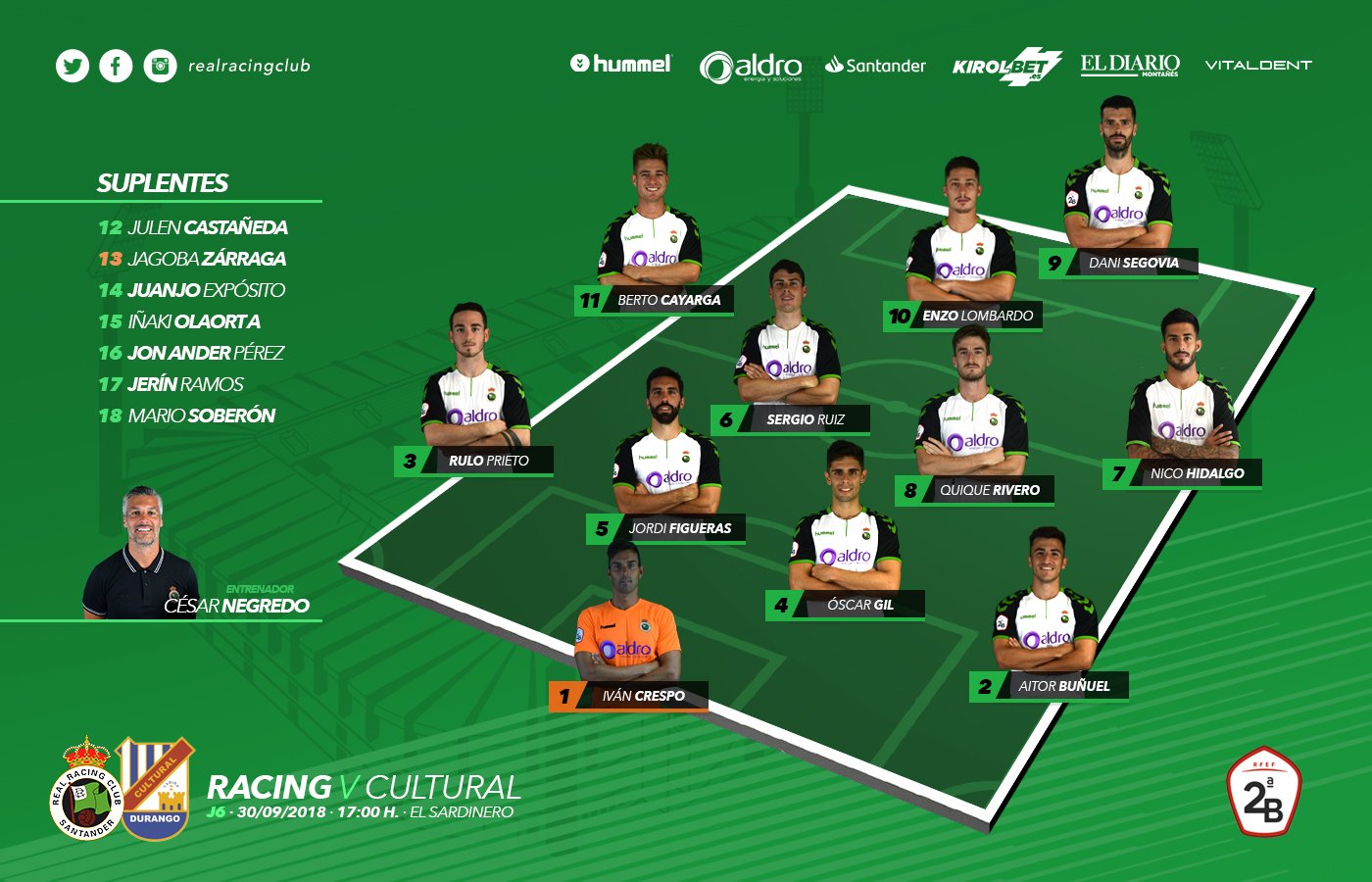 #88• Las bajas de Kitoko y de De Vicente creo que van a obligar a Ania a repetir el once que puso ante el Arenas, en el que ha sido el mejor partido hecho por el Racing hasta la fecha, ante un rival menor y jugando en casa este partido pueda ser idoneo para jugar con Sergio y Rivero en el centro del campo con Lombardo en la media punta asociandose con los centrocampistas, bajando a recibir y haciendo daño entre lineas, la duda creo que estara en ataque teniendo opciones de salir de inicio tanto Segovia como Jon Ander. Como ha dicho Suppi rival a priori propicio para aumentar nuestra cifra de goles a favor, aspecto que a final de liga puede suponer incluso quedar primeros o no, recordemos que la Cultural cuando ascendio nos privo de campeonar por el golaverage.  | |