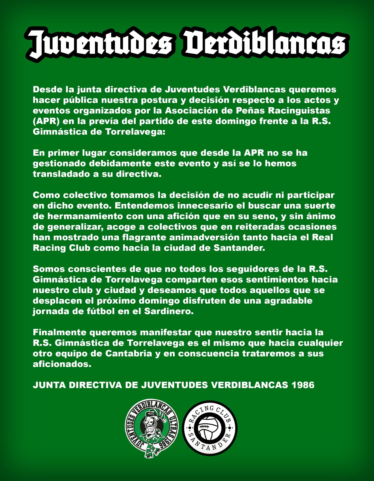 #56• Escrito originalmente por @MentalidadRRC Qué queréis que os diga, esto de intentar crear "hermanamientos" o "rivalidades" surgidas de la nada. Fútbol es fútbol, y está claro que no se entiende sin piques, sin pequeños amigos o enemigos, etc. Pero de ahí a querer "hermanar aficiones y toda esta historia... Se muy bien de lo que hablo, y mientras historicamente desde Torrelavega (por lo general) solo se genera odio, envidia, insultos y demás hacia el Racing y Santander, desde Santander (por lo general), solo se tiene cariño hacia la Gimnastica y el resto de clubes de Cantabria. Imagino que tenga que ver con ese sentimiento de inferioridad que deben de tener (no entiendo la razón porque cada uno juega su papel en el fútbol) por el que siempre se han querido comparar, cuando el auténtico derbi histórico les ha enfrentado con el Racing B. El comunicado de Juventudes es SU COMUNICADO, y hacen lo que creen conveniente al no alimentar una falsa supuesta amistad con una afición que repito, por lo general, solo te desea el MAL, y que se vanaglorian además de por ejemplo ser amigos de Symacchiary, grupo ultra del Oviedo y uno de los mayores "enemigos" de Juventudes. Pero como dejamos de lado el mundo ultra, simplemente por mi parte respaldar a jjvv en su decisión, y que el resto de la afición, tanto de allí como de aquí, disfruten de un espectacular día de fútbol (como ellos dicen en su comunicado). Mucha gente lo celebrará con amigos racinguistas y gimnásticos, jjvv se montarán la fiesta por su cuenta. Mientras solo sea un partido de fútbol, que así será, que cada uno lo celebre como quiera (digo yo...) No creo que se trate de crear hermanamiento de la nada, si no hacer de un derbi cántabro, una fiesta. Cualquier excusa es buena para algo así. Y lo que sería ideal, es aislar a los cuatro tontos de aquí y de allí y que no haya ningún tipo de incidentes y por contra, si un ambiente festivo. JJVV es libre de hacer un comunicado para desmarcarse y criticar esta iniciativa, y el resto es libre para opinar sobre este comunicado. Yo creo que si no quieres participar, nadie está obligado y con lo hacerlo, sería suficiente. Ellos han considerado que tenían que desmarcarse claramente. Ellos sabrán porqué.  | |