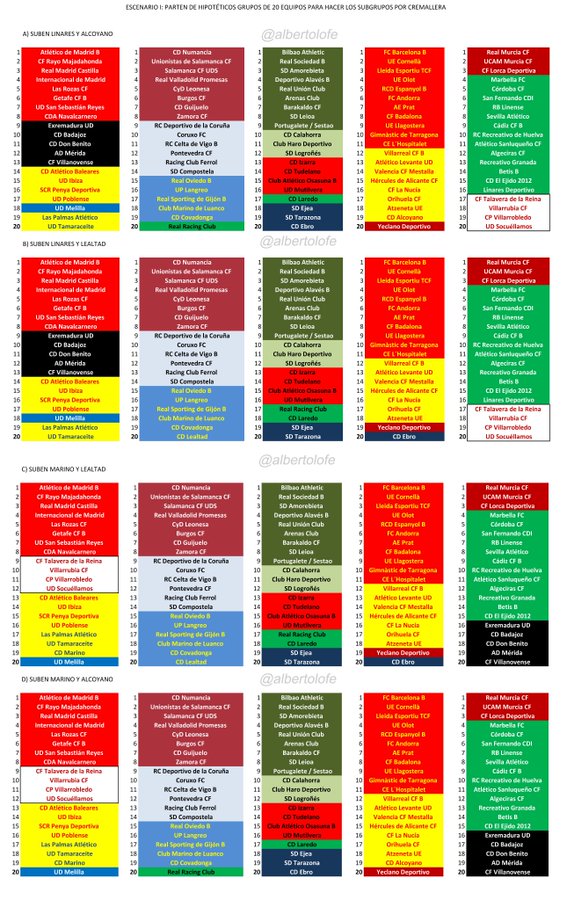 #338• Escrito originalmente por @ociepa Escrito originalmente por @Enem1go Escrito originalmente por @farfope Hoy dice el diario qje nos pueden mandar con cadtilla leon galicia y asturias . Pues sería un grupo como para sufrir en la primera fase y hacer muy buena temporada para entrar entre los 3 del playoff: Dépor, Cultu, Numancia, los filiales (Sporting, Oviedo, Celta, Valladolid), más algún clásico que seguro que hará buena temporada (Burgos, Pontevedra, Racing de Ferrol, Salamanca, Compos...). De todos modos creo que salen más de 20 equipos, porque me faltan Coruxo, Guijuelo, Laredo, Covadonga, Lealtad -que aún puede subir-, Unionistas, el que haya subido del grupo castellano... y alguno que seguro me he dejado. Seguramente los asturianos, gallegos y castellanos ya suman 20, si acaso lo mismo tienen que empujar al Burgos al 2 y/o al Numancia al 2 o el 3. Yo nos veo con País Vasco, Navarra y La Rioja... que debemos de estar cerca muy cerquita de ser 20. Imagino que el 3 serán Catalunya, Baleares y Com. Valenciana... veremos a ver si cabe Aragón, o sí tienen que desplazar a los alicantinos al 4. El 4, Murcia, Andalucía y los manchegos, si caben. Y el 5 el en engendro Madrid, Canarias, Extremadura, ¿Talavera?o, lo mismo los Salamancas y/o el Guijueki, si no caben en el 1... A ver cómo acaban los ascensos, pero yo creo que irán por ahí los tiros... ¿alguien tiene la lista de equipos por comunidades? Estas son las propuestas que ha hecho un aficionado dependiendo de los ascensos que faltan Alberto Lozano @albertolofe Partiendo de los enfrentamientos de eliminatorias, he intentado ver como podría quedar el tema de cara a la 20/21. Si partieran de grupos de 20 para luego aplicar subgrupos en función de la cremallera, me da que pueden separar murcianos al ser ya seguro un canario u otro andaluz. La opción 1 y 4 es para llorar. 3 descendidos en el mismo grupo. | |