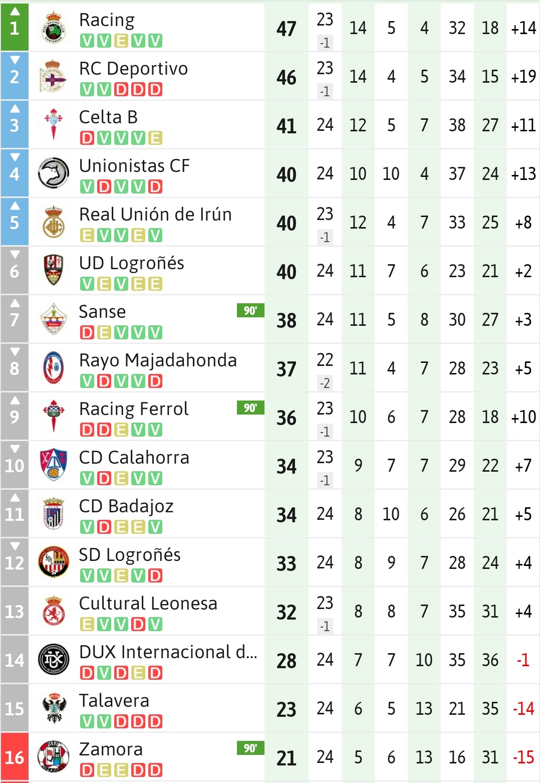 La semana que viene hay un Celta-Unionistas, Logroñés-Rayo, Sanse-Depor y racing-real Unión. O, lo que es lo mismo, los ocho primeros juegan entre sí. Nueva oportunidad para seguir abriendo brecha. | |
