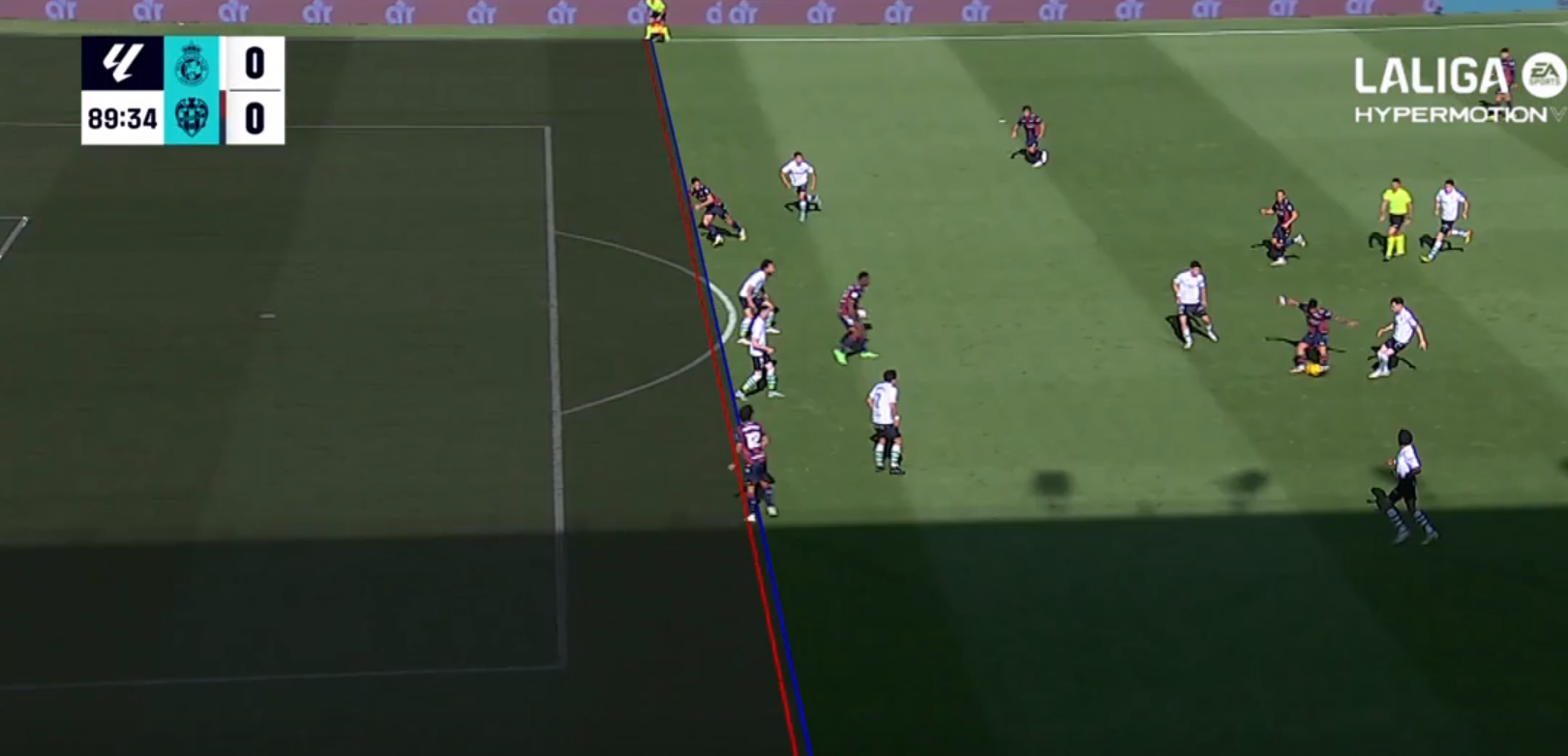 #164• A ver, esa línea está tirada al pie del otro del Levante. La verdad es que son unos vagos y pasan porque el hombro del que marca el gol también está adelantado y ahí hay que proyectar donde está el hombro respecto al plano del campo y no les ha dado la gana hacerlo. Yo he trabajado 10 años tirando líneas y con la repetición ya se veía bien. | |
