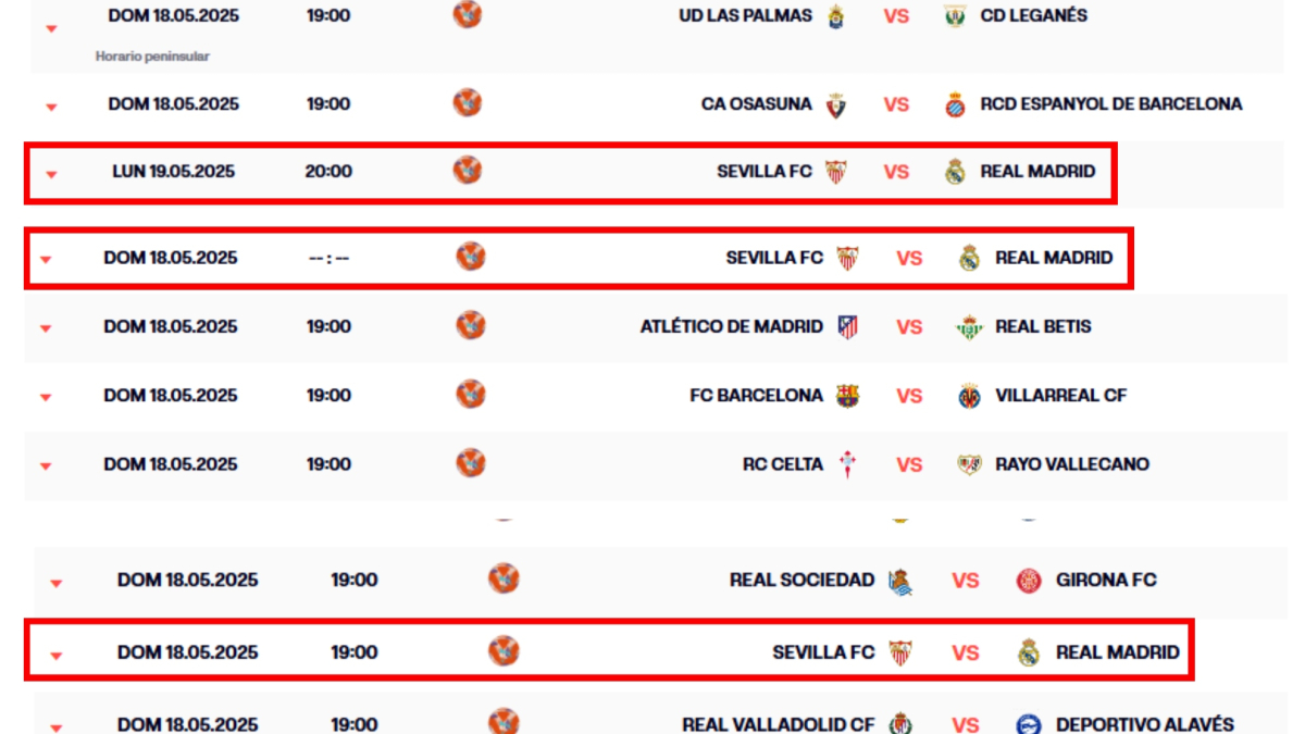 • Realmente no han hecho nada, algo me dice que se han cogido el puente de San Isidro y seguimos sin horarios. Los horarios de 1ª llevan ya un tiempo publicados, solo han intentado hacer el cambio del Sevilla - Madrid que ha salido mal. |