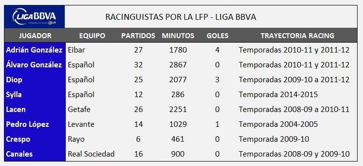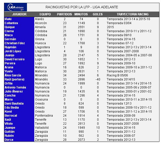 ex-jugadores del racing en primera y segunda division. Publicado por racinguismo.com http://www.racinguismo.com/2016/04/[....]a-racinguista-en-el-futbol-lfp.html