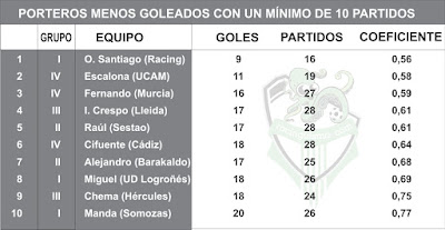 #54•• pues hoy, si no me equivoco, oscar santiago es el portero del grupo I con mejor coeficiente de goles por partido, en 12 partidos 7 goles encajados, 0.58 goles por partido. Y posiblemente el portero menos goleado de toda la segunda b, otro cantabro, raul dominguez del sestao, con 11 goles en 24 partidos 0.45 | |