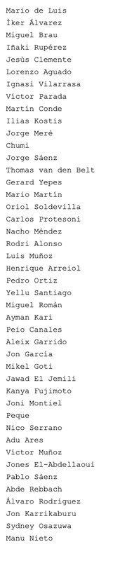 #2.996•• Mario de Luis Iñaki Rupérez Sergio González Sergio Barcia Jon de Luis Víctor Parada Juergen Elitim Mikel Goti Sergio Canales (matizo, para enero) Peque Estanis Pedrola Víctor Muñoz Sydney Osazuwa Gonzalo García Jon Karrikaburu Ibai Sanz | |