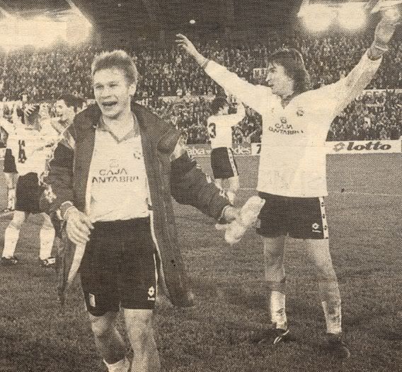 #8• Escrito originalmente por SoloRacing Siempre en el recuerdo Deviot. Por lo menos en el mío. Durante estos días de Navidad fue el mítico Athletic 1- Racing 2 en San Mamés. Seis mil pelas me costó la entrada, aún la conservo, pero vaya dinero más bien gastado. Recuerdo el gol de Radchenko, vaselina del zar y el balón iba hacia la portería lento, muy lento. A mí esa impresión de dió, luego viéndolo en la tele parece que no, que lleva una velocidad normal. Luego vino el éxtasis, rodeado de bilbainos vaya gritos que dí, no lo podía reprimir, mis amigos decían que estaba loco. Para mí el mejor gol de la historia del Racing, el más importante no, pero sí el mejor. Recuerdo ese partido en la grada de San mamés. No he llorado tanto en mi vida (entre el txakoli y la emoción...vaya). Venga quien venga en el futuro, para mí los mejores extranjeros del Racing seran los dos rusos de aquella época | |