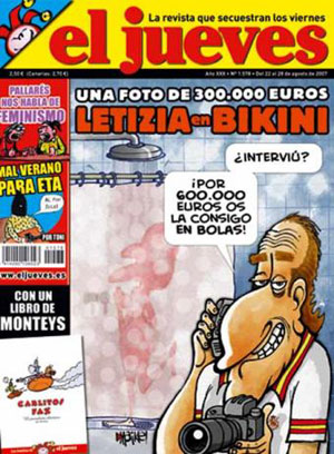 #55• LA FAMILIA REAL, DE NUEVO PROTAGONISTA 'El Jueves' vuelve a la carga![]() Portada del nuevo número de 'El jueves'. Actualizado miércoles 22/08/2007 13:39 (CET) RAQUEL QUÍLEZ MADRID.- La revista satírica huye del escarmiento y dedica su portada, de nuevo, a la Familia Real. En esta ocasión, los objetos de burla son los 'paparazis', los lectores deseosos de ver a las féminas reales en traje de baño y las revistas del corazón dispuestas a pagar cifras astronómicas por esas imágenes. El Rey es el personaje elegido para escenificar la broma. Cámara en mano, aparece un monarca caricaturizado y dispuesto a vender a Interviú unas instantáneas de la Princesa de Asturias desnuda a cambio de 600.000 euros. Tras él, se adivina la silueta de Letizia en la ducha. Con esta portada, 'El Jueves' vuelve a tomar a la Familia Real como protagonista de su primera página después de la polémica levantada por su número de finales de julio, en el que dibujó a los Príncipes en pleno acto sexual. La imagen no gustó al juez Del Olmo, que ordenó, a instancias de la Fiscalía, retirar la revista de los puntos de venta por un presunto delito de injurias a la Corona. El proceso terminó con el dibujante Guillermo y el guionista Manel Fontdevila, padres de la viñeta, declarando ante el magistrado de la Audiencia Nacional. Como acto de enmienda lanzaron una nueva portada con la leyenda '¡Ésta es la portada que queríamos publicar!' y un dibujo del Príncipe de Asturias disfrazado de abeja sobrevolando una flor caracterizada como Doña Letizia. | |